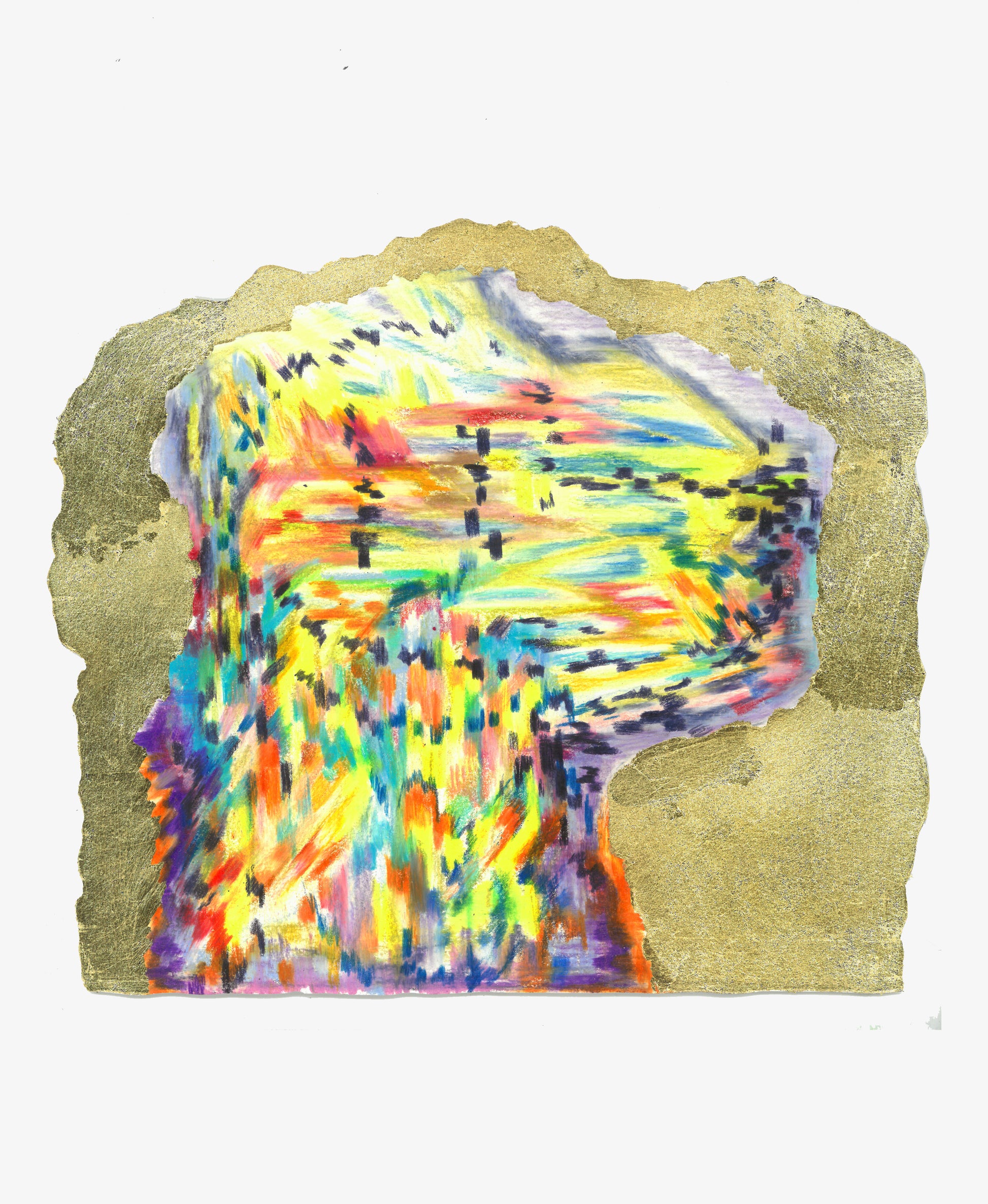 Flux depicts a head dissolving into streaks of radiant color, a portrait caught between presence and disappearance. Glitches of black fracture the flow, while gold leaf frames the figure in both fragility and reverence—an image of identity in perpetual transformation.