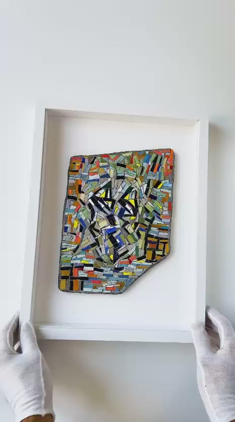 GLITCH is a portrait unravelled into static—shards of color scatter like broken signals, while dark tesserae cut across the flow like ruptures in memory. What emerges is not a fixed face but a flicker, a self caught between coherence and collapse, beauty and distortion.
