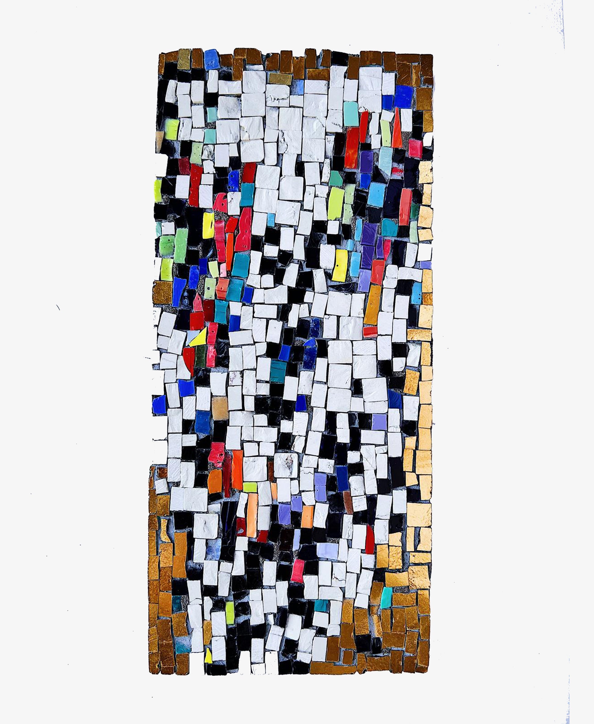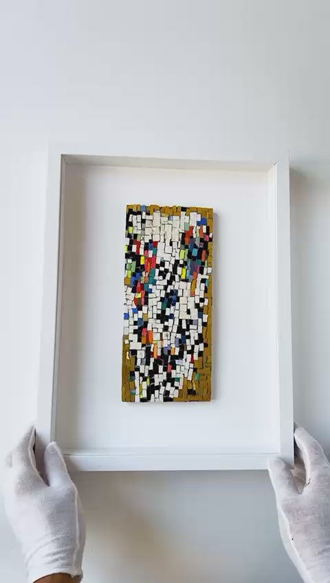Fluxion is a meditation on identity and distorted reality, where shifting fields of white, black, and sudden bursts of color suggest a self in constant flux. The irregular tesserae fracture perception, creating moments of clarity interrupted by distortion, while the gold border frames the instability within. The work reflects how identity resists fixed definition—fragmented, luminous, and perpetually in motion.